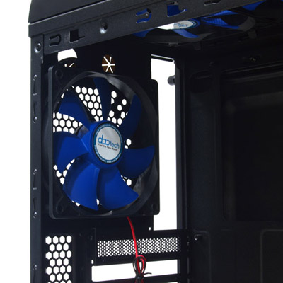 フロントにブルーLED搭載12cmファン1個、リアおよびトップに12cmファン計3個の合計4個を搭載済み。