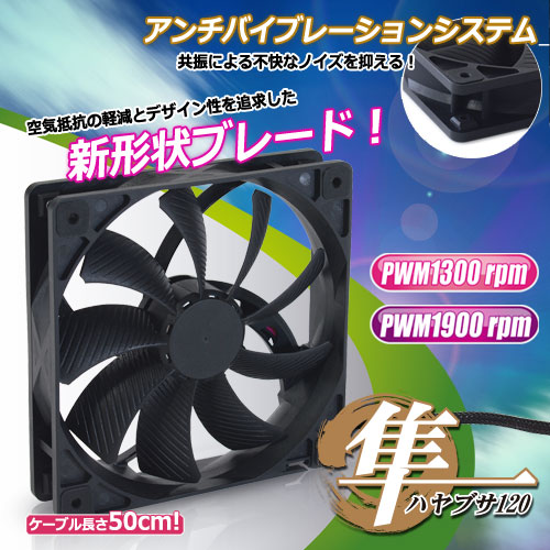 サイズオリジナル設計小軸大型ブレード採用12cmファン、新形状ブレード・ラバー製防振ネジ受け採用、1300rpmモデルと1900rpmモデルの2種類