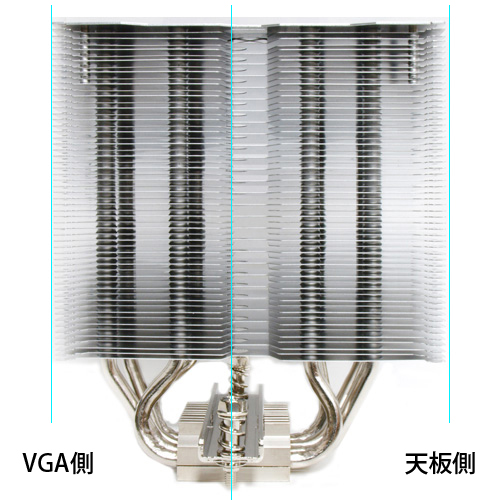 ナロータイプフィン構造と2枚の形状の異なるフィンの組み合わせにより、ファンの風を効率良く吸い込むフィン設計。