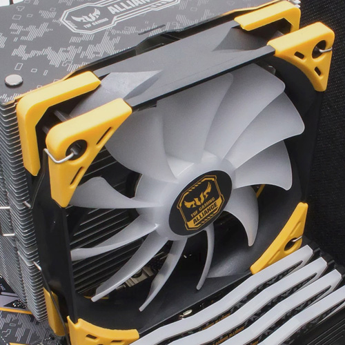 ヒートシンクのトップにTUFパターンデザインを施し、TUF GAMING ALLIANCEのデザインやカラーリングを採用。 搭載ファンのKAZE FLEXにおいても、GAMINGモデルに相応しいAURA SYNC対応の4ピンRGB仕様!