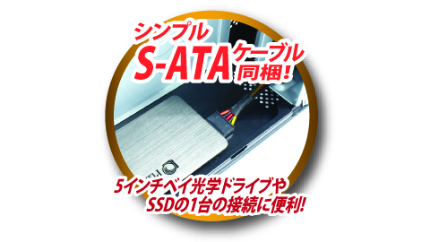 5インチベイ光学ドライブやSSD1台の接続に便利な1コネクタ仕様のS-ATAケーブルを1本同梱。